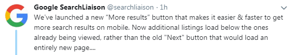 In a bit of good news for web publishers, Google announced via Twitter a change to Google Mobile Search that will show more links to web pages faster. If the default search results do not satisfy the user they will have the option to click a “More results” button that will show links to more pages. This change affects both the Android and iOS Google search apps as well search on major mobile browsers except for Chrome for iOS. Support for Chrome iOS is coming soon.